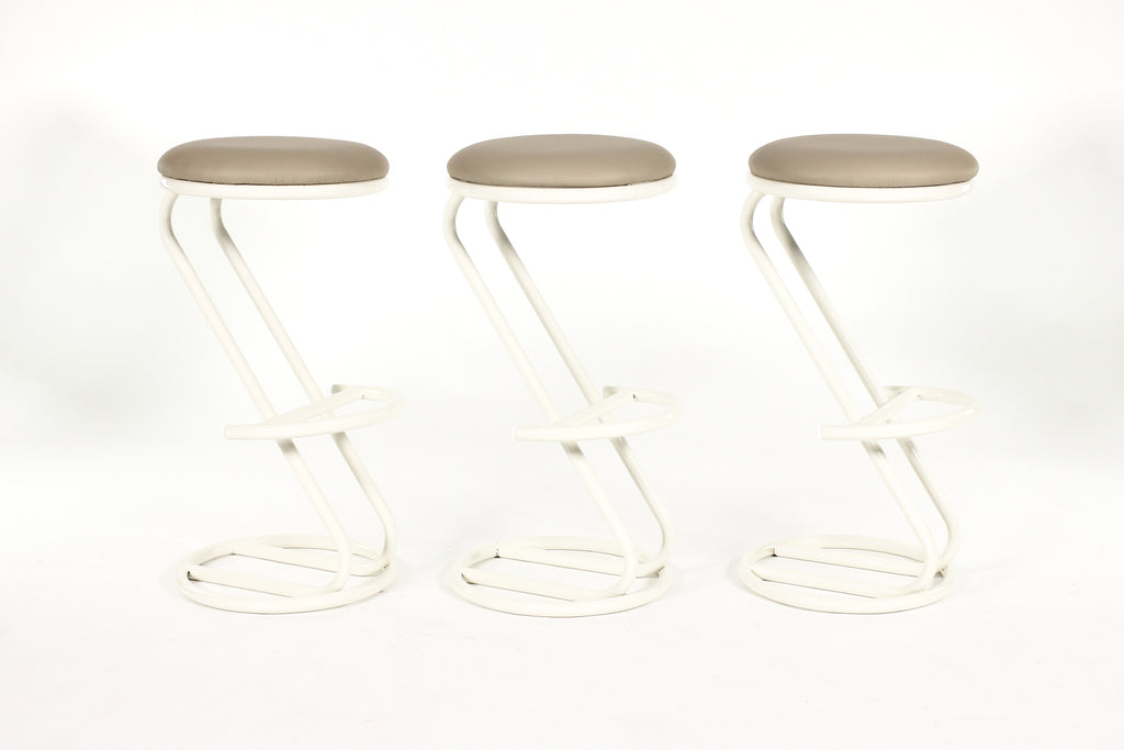 Great set of three French modernist bar stools designed by Louis Sognot. Cantilievered Z style frames. 1970's era. Fully restored with fresh cream / pearl powdercoating on the frames and fresh seat upholstery done in quality leather. All three are in excellent shape and quite comfortable.