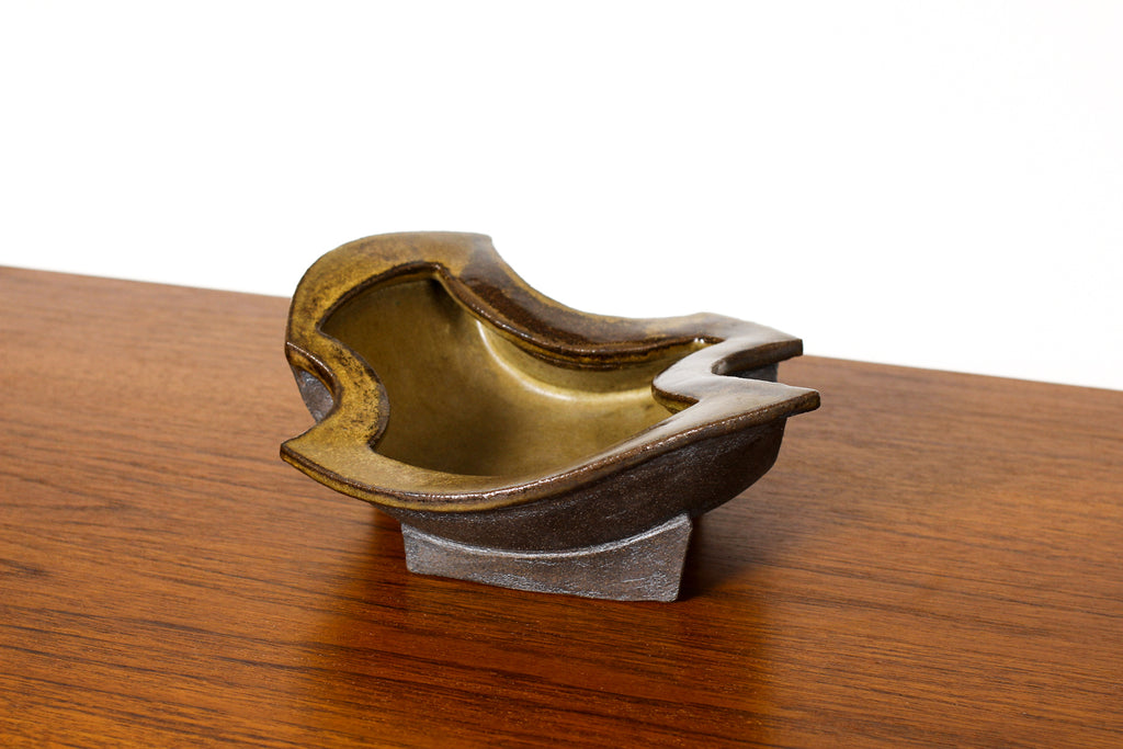 Sculptural stoneware bowl — hand built construction by ceramic artist John Riccio. Sweeping curved forms with a modern edge. Dark brown stoneware with green / brown glazed interior.